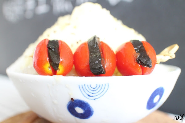 奇異番茄蜜,酸酸甜甜淡黃色的奇異果醬披覆在剉冰上,搭配上一串包夾蜜餞的蕃茄,風味冰涼清爽。
