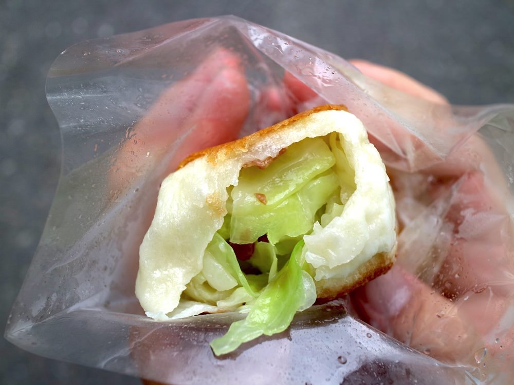 裡面包滿鮮甜的高麗菜,還吃得到鮮紅色的枸杞