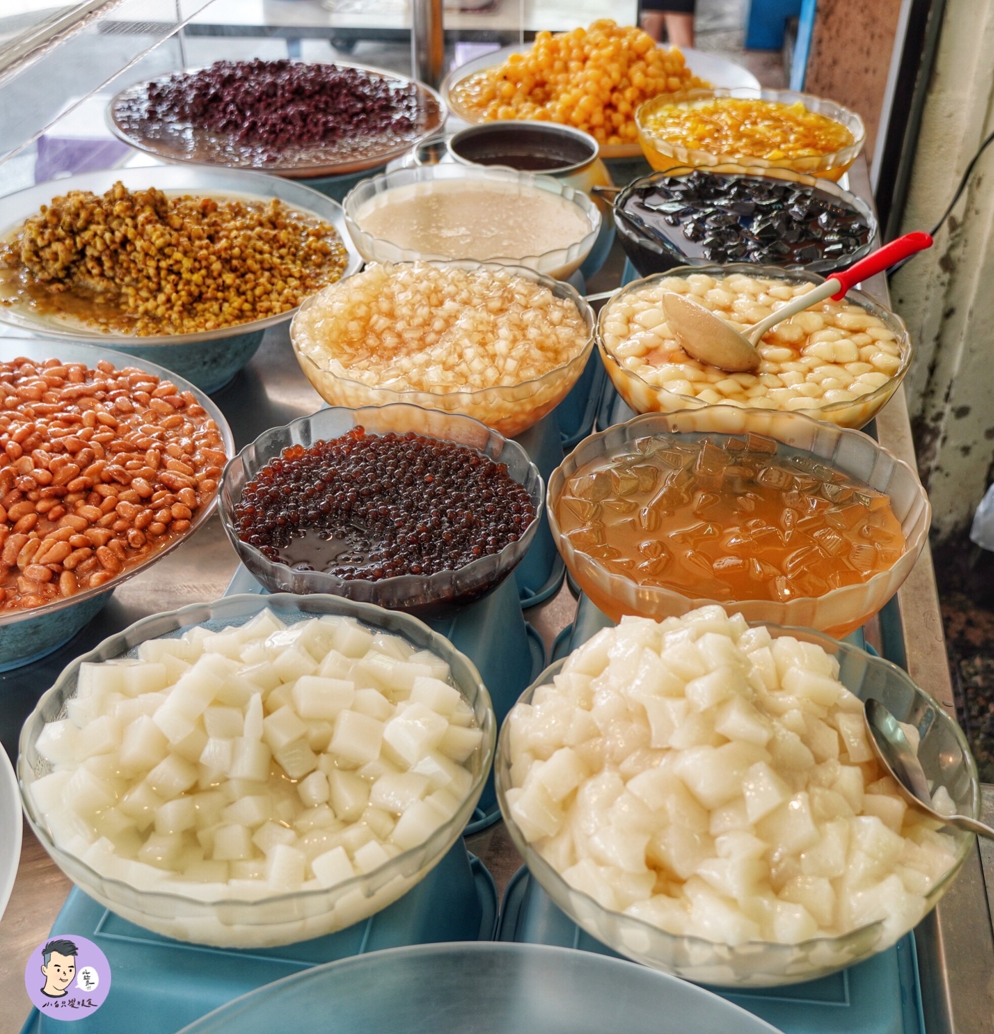 芋頭、湯圓、愛玉、仙草、杏仁粉粿、杏仁豆腐、花生、彎豆、綠豆、紅豆、粉圓、粉角、麥片、蓮子、鳳梨 15種配料可選。