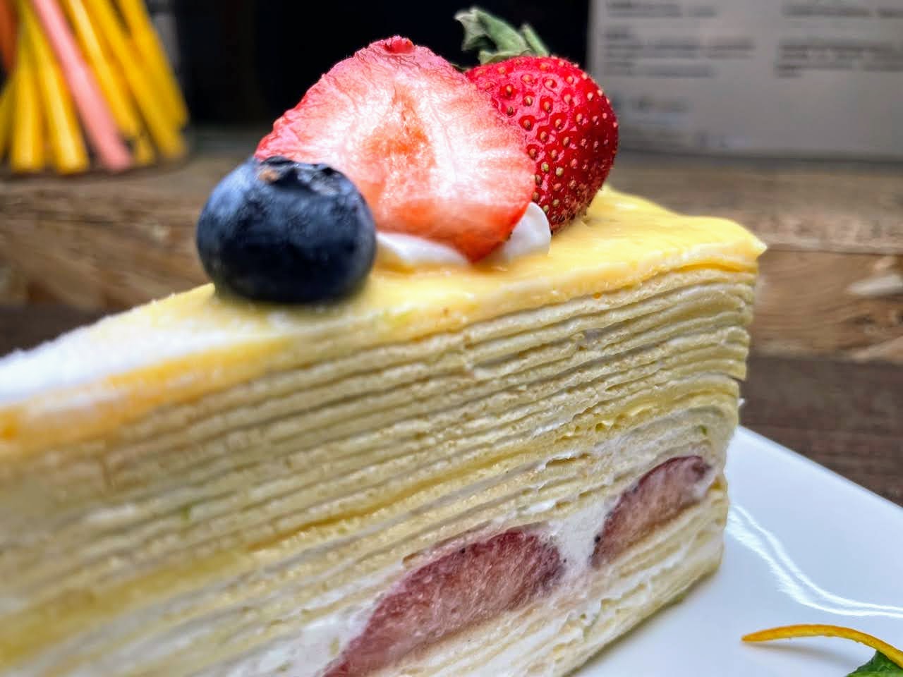 用滑嫩的千層餅皮夾裹蜂蜜萊姆為基底的抹醬,上面放滿頗半的新鮮大湖草莓,中間再放上一點藍莓,整體配色相當好看,尤其現在草莓季剛開始,新鮮正是時候。