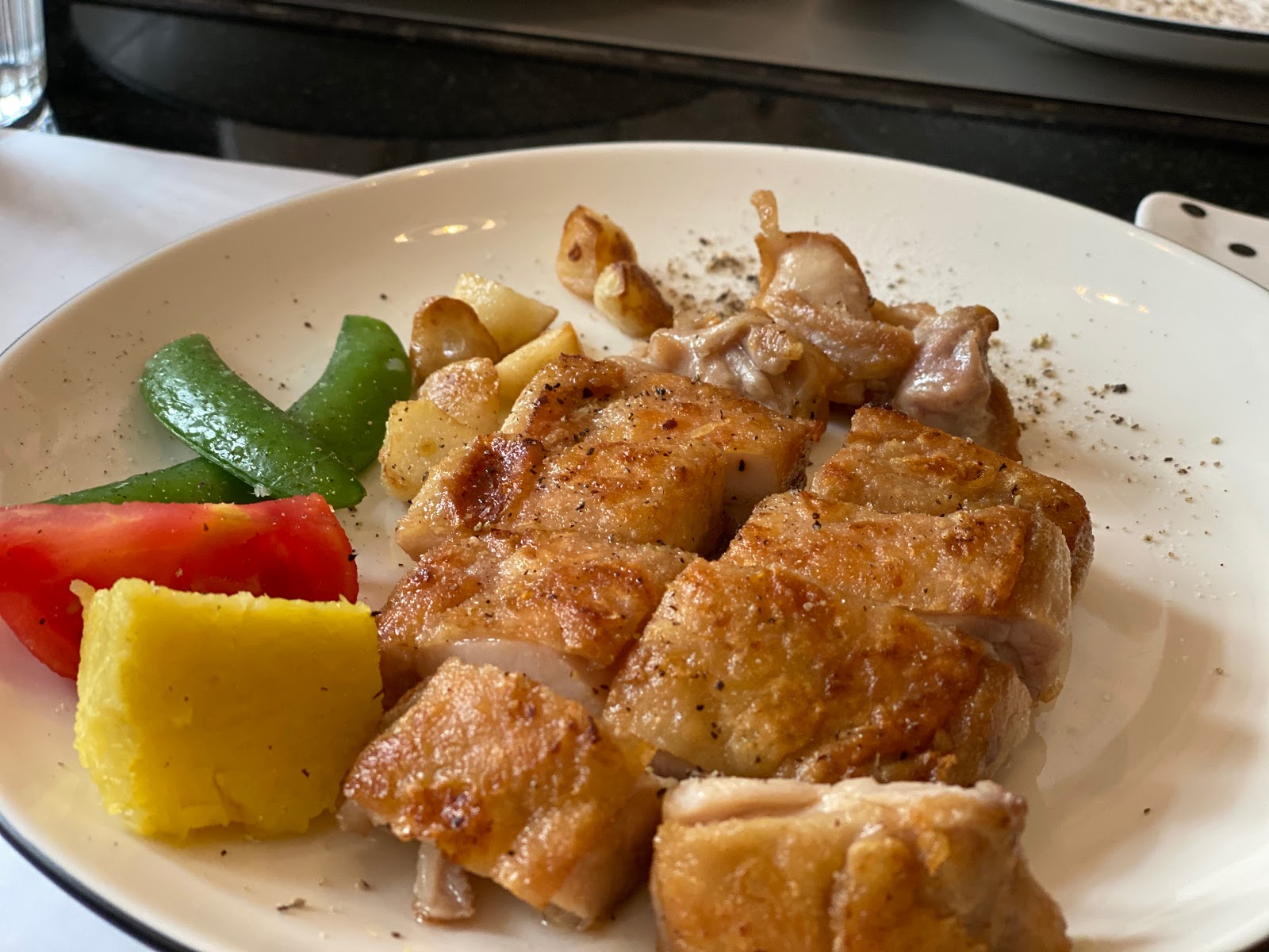 雞腿的皮煎得很香脆,火候的控制相當得宜,肉汁都有鎖住!