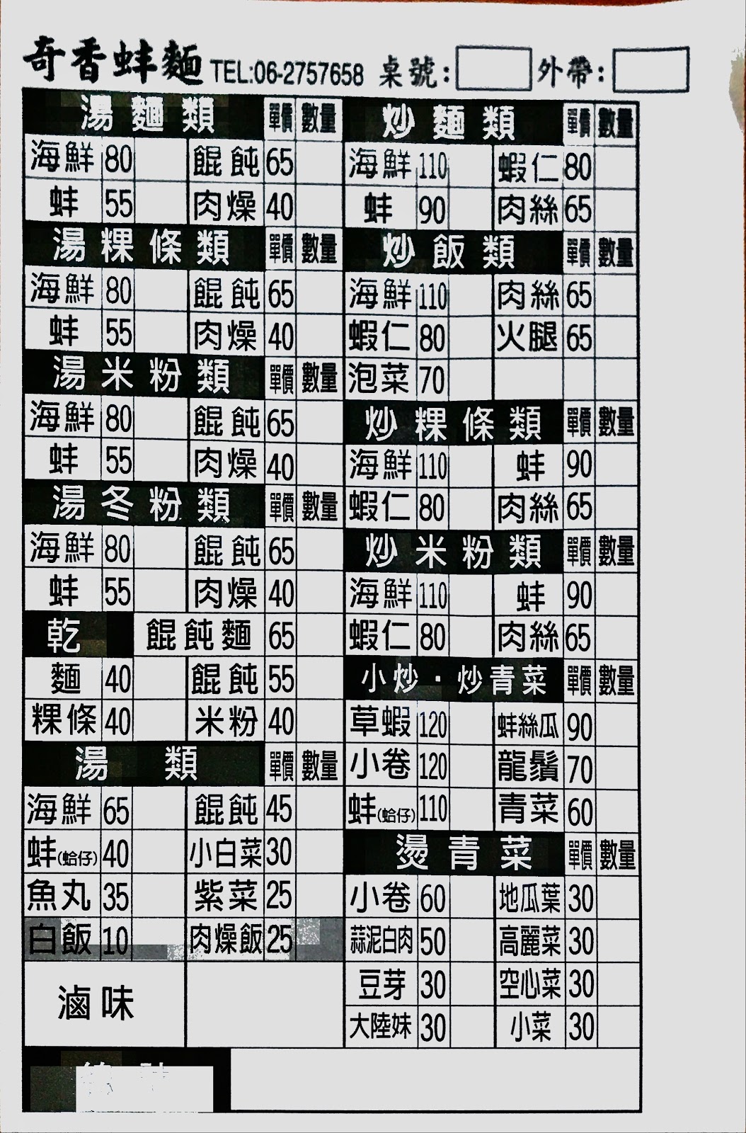 奇香蚌麵的菜單 很簡單好理解