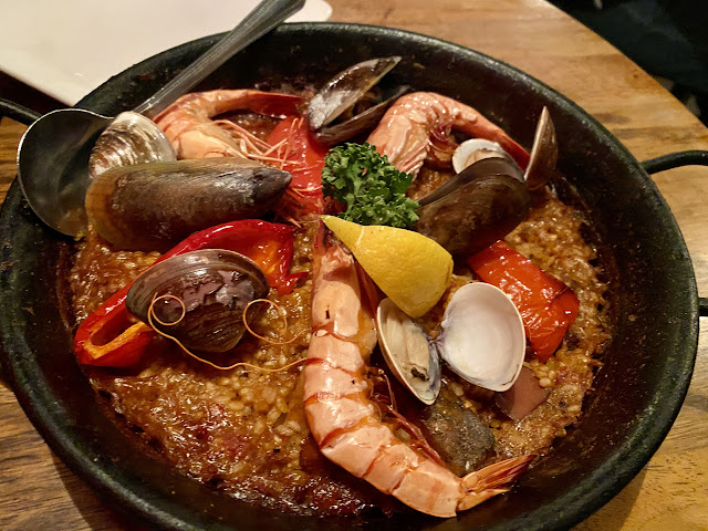 吃了前面幾道料理,終於等到今天的重頭戲了-西班牙海鮮大鍋飯,我等這道菜差不多等了一個多小時(這家餐廳送餐速度非常慢,非常歐洲速度,哈哈~)這道菜也是PS TAPAS的招牌菜,在門外的看板就看到它的照片了~各式各樣的新鮮海鮮鋪在米飯上,配上鮮豔的配色,讓人看了就很開胃。