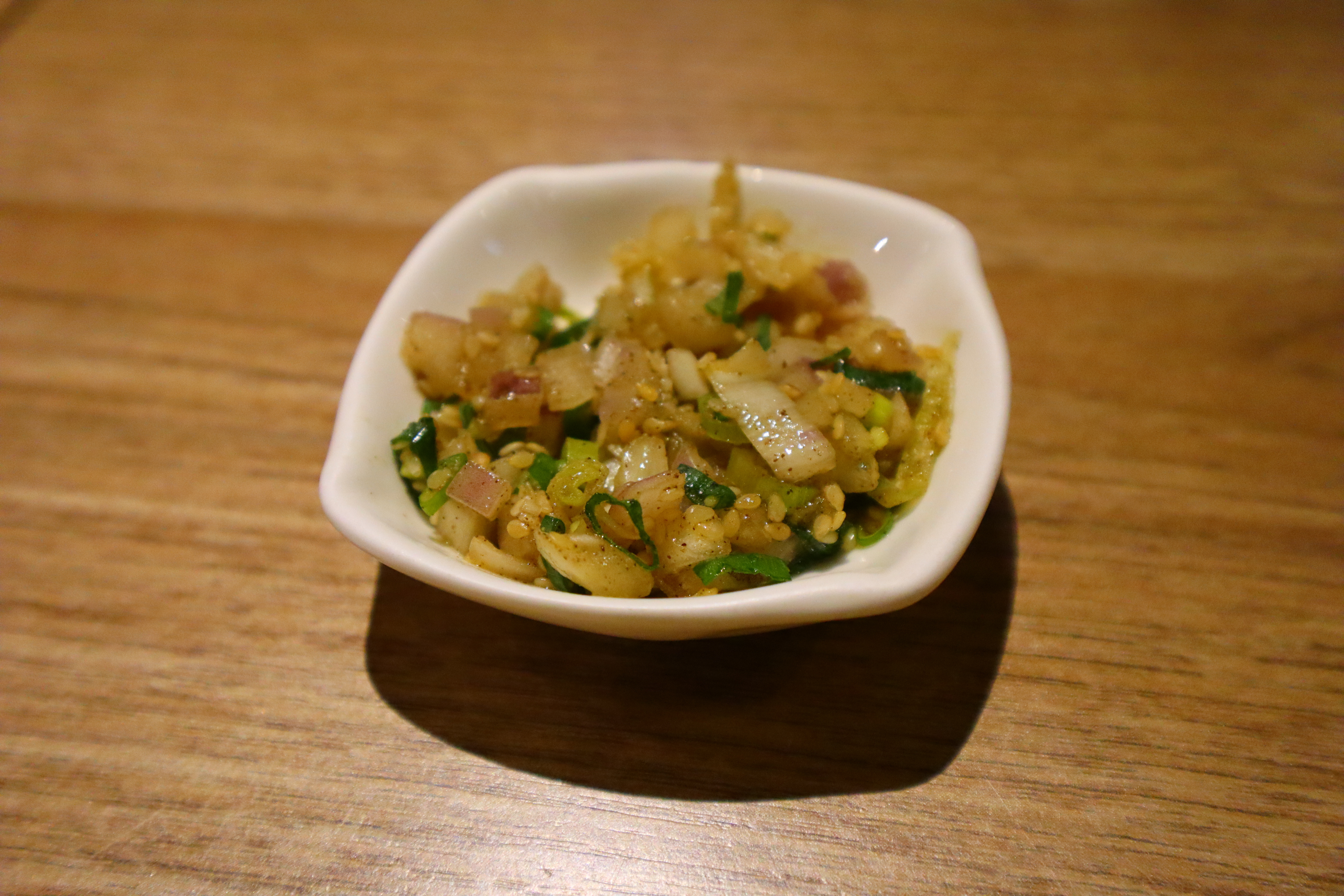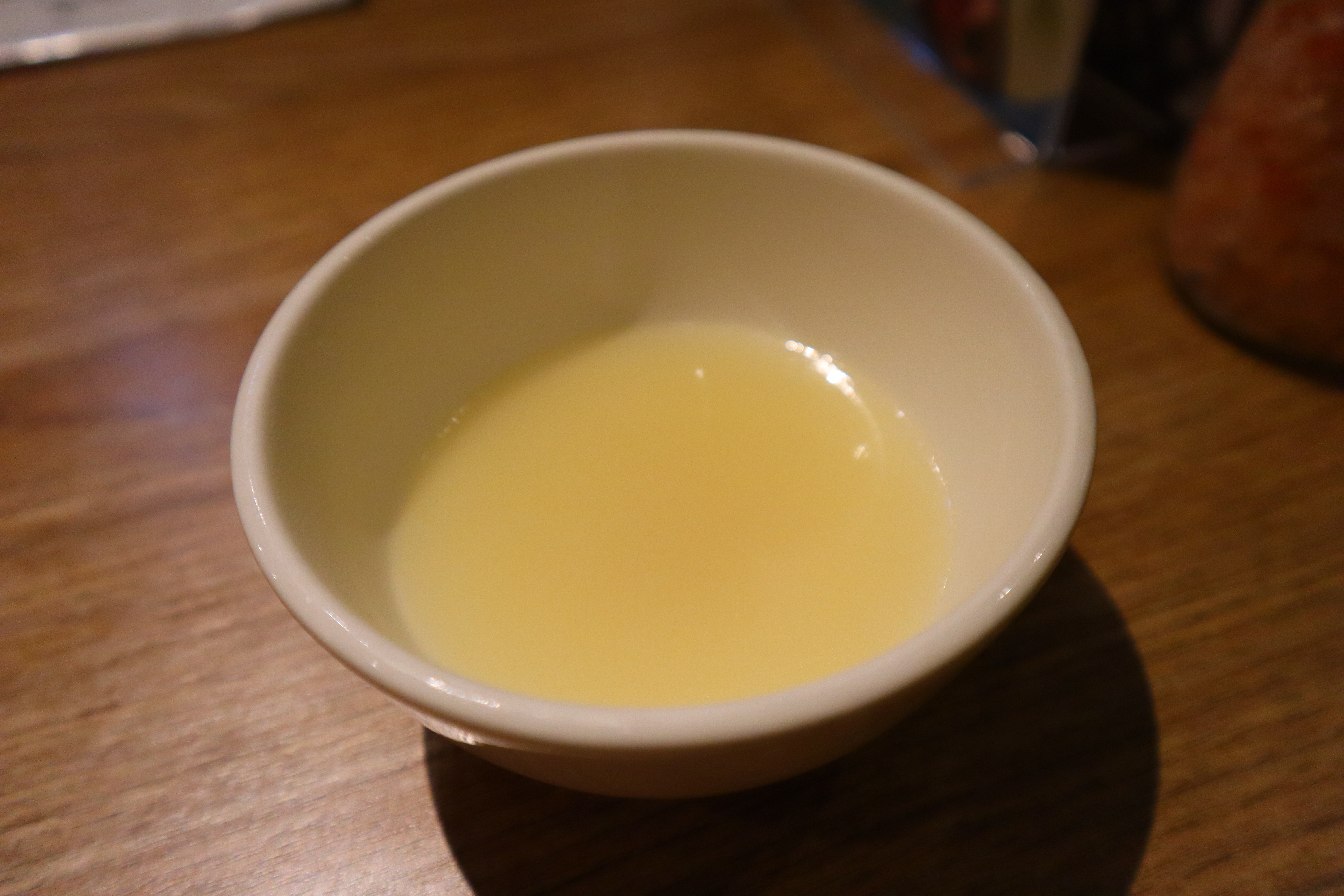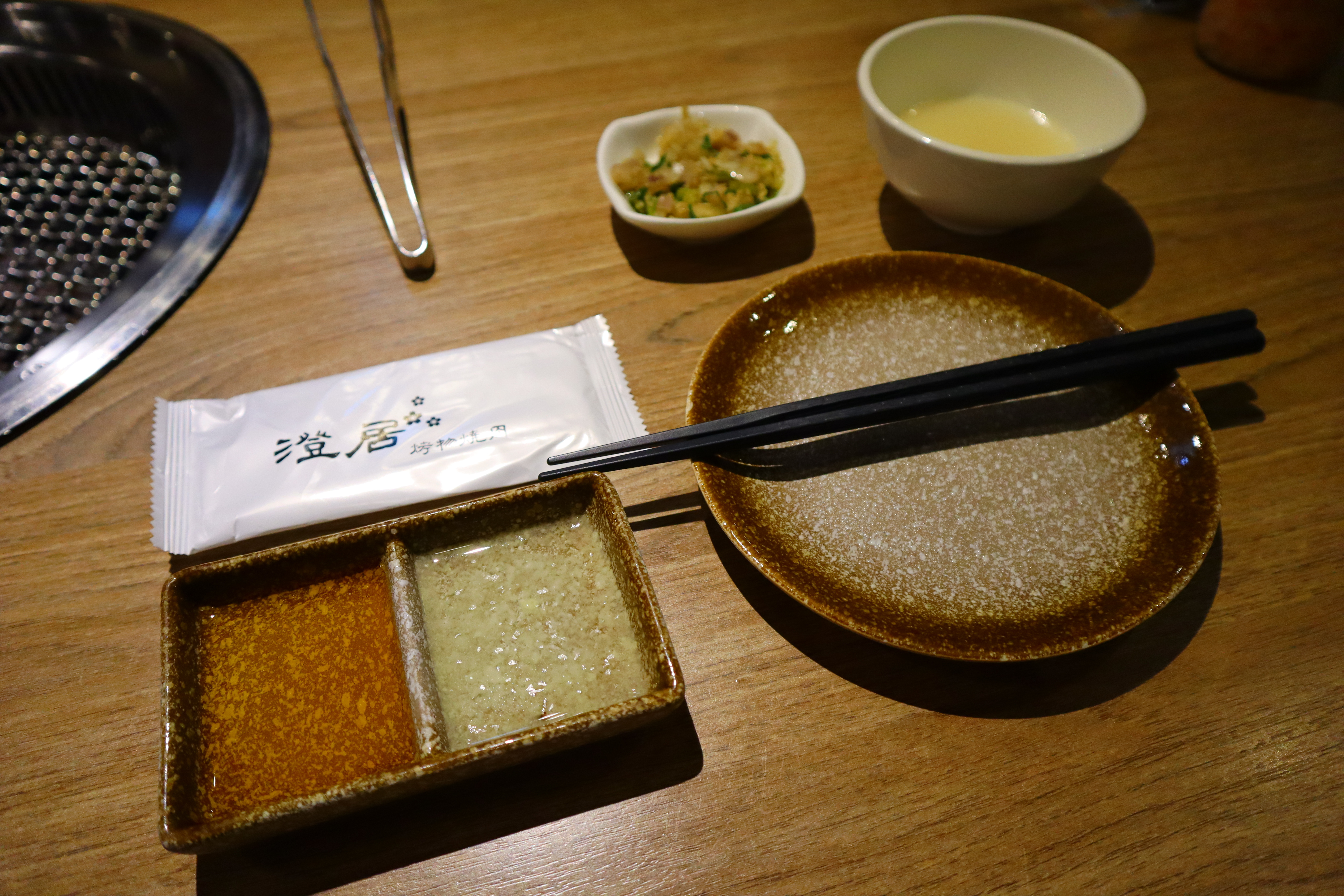 座位上的基本盤,蔥鹽、雞湯以及兩種調味料(燒肉醬和檸檬汁)。