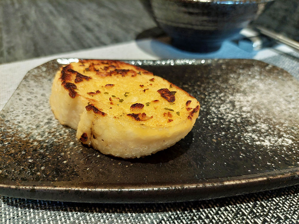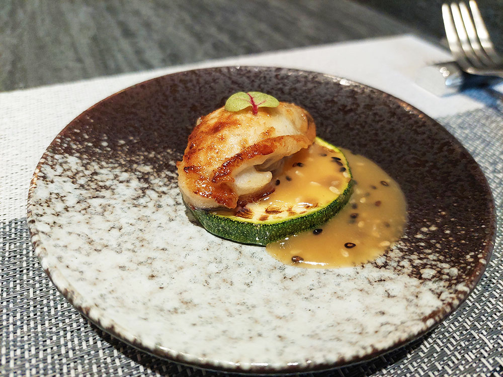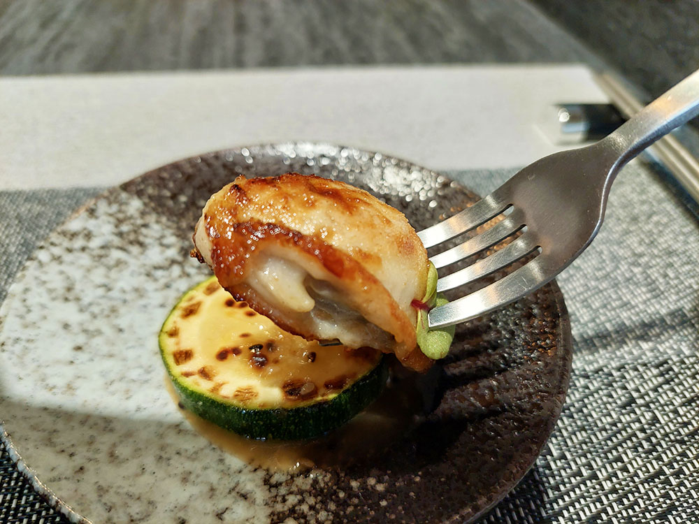 下一道主廚端上的是乾煎日本生蠔,超大顆的生蠔配上櫛瓜、淋上芝麻味噌醬,一口咬下超滿足。最上面的小小葉子是可食用的,主廚有介紹不過我忘了名字…😅
