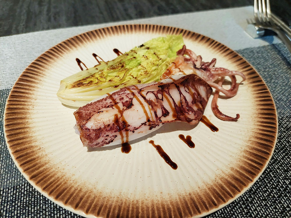 七月正值澎湖中卷、小卷產季,這道澎湖鮮味中卷是當季限定料理,主廚說中卷本身就自帶鹹味了,因此只有簡單淋上義大利進口的醋膏提味,再搭配一旁的娃娃菜。