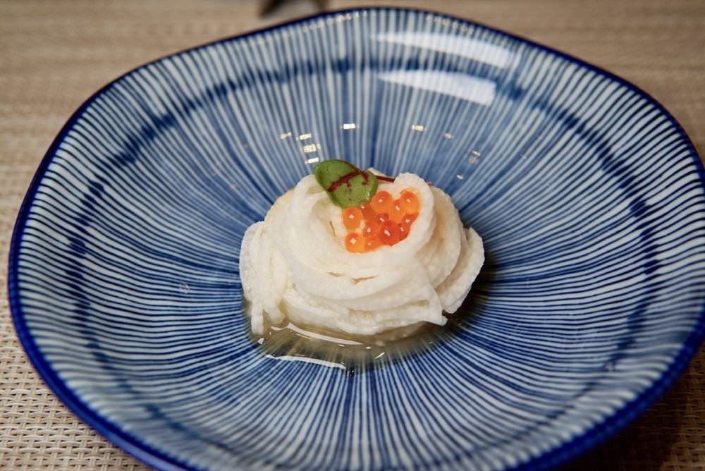 ▼ 第一道上的是山藥細麵佐鮭魚卵,山藥做成的細麵口感滑順綿密,搭配新鮮鮭魚卵多了一份鮮甜味!