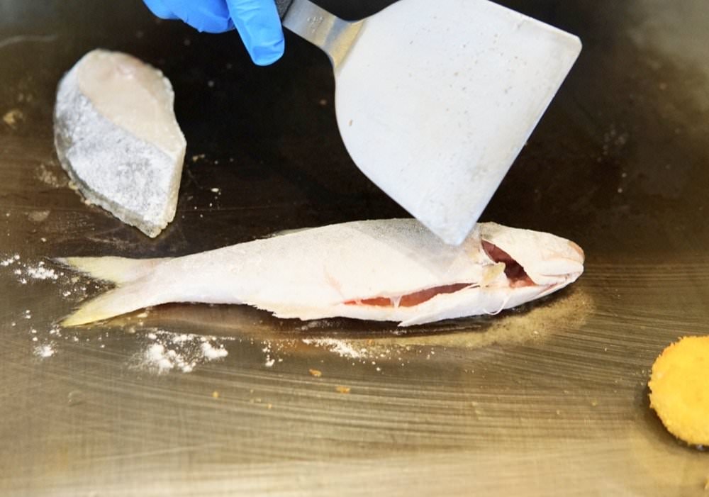 ▼ 1390套餐附的鱈魚是我們常看到的扁鱈,表面煎得酥香,裡頭肉質仍然很滑嫩,一樣原味就好吃,沾一點點芥末椒鹽是另一種富有芥末香氣與鹹味的口感!