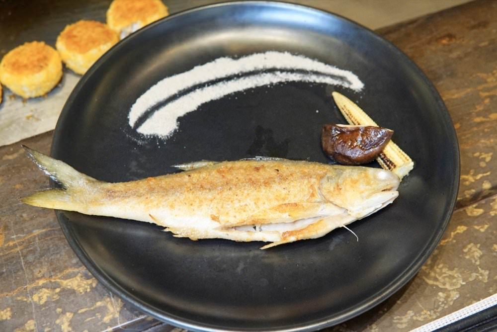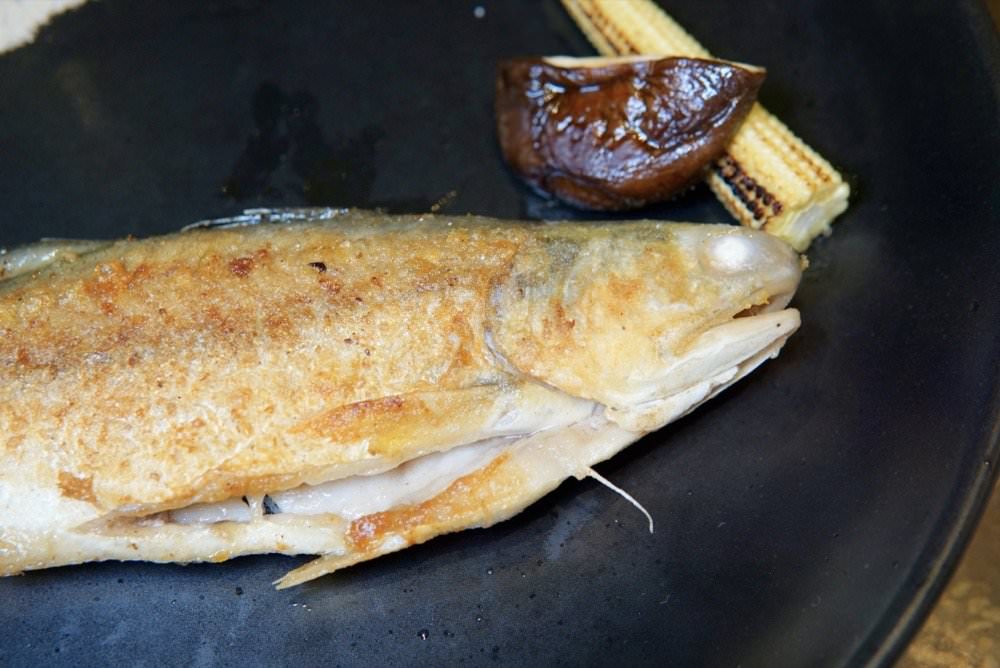 ▼ 午仔魚旁邊的香菇煎得超嫩會出汁,玉米筍很脆口,仙上桌給我們拍照之後,師傅就幫忙去午魚的大骨,搭配明水然特製的芥末椒鹽非常好吃!!