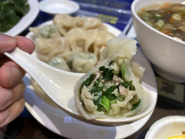 招牌口味的水餃是使用韭黃、高麗菜、豬肉,吃起來的蔬菜甜味是蠻明顯的。雖然鮮度、特色比不上干貝和韭菜水餃,但其表現在各水餃店也是排很潛力,一口吃下可以看到豐腴的肉汁、菜汁湧出,甜而多汁,加上爽脆的口味,真的非常好吃。