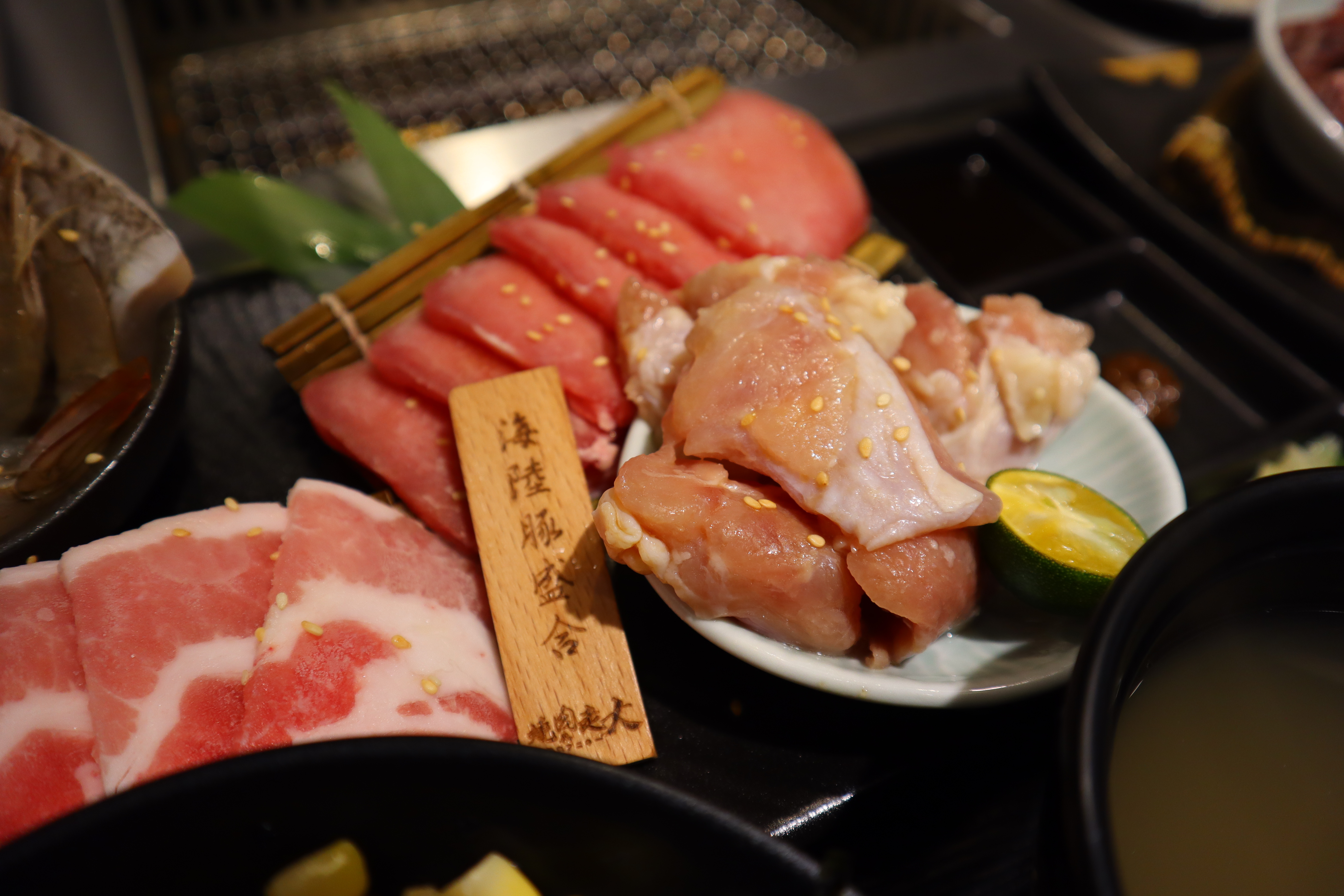 海陸豚盛合是由厚切豚菲力、豚五花、雞腿肉、鱸魚菲力以及鮮蝦所組成的。