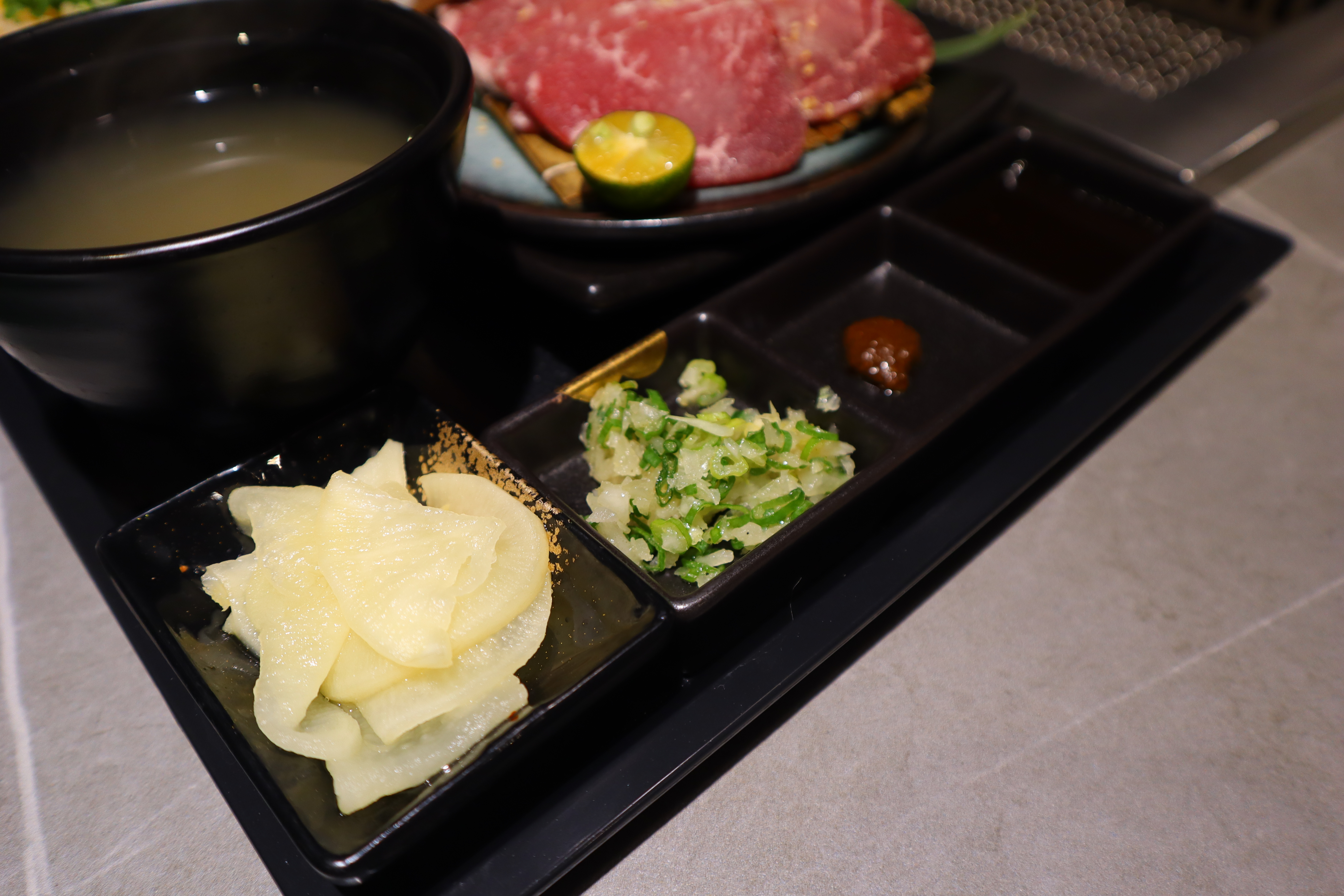 每個套餐會搭配蔥鹽、麻辣醬和烤肉醬,另外還有一格可以選擇柚子蘿蔔、韓式泡菜。