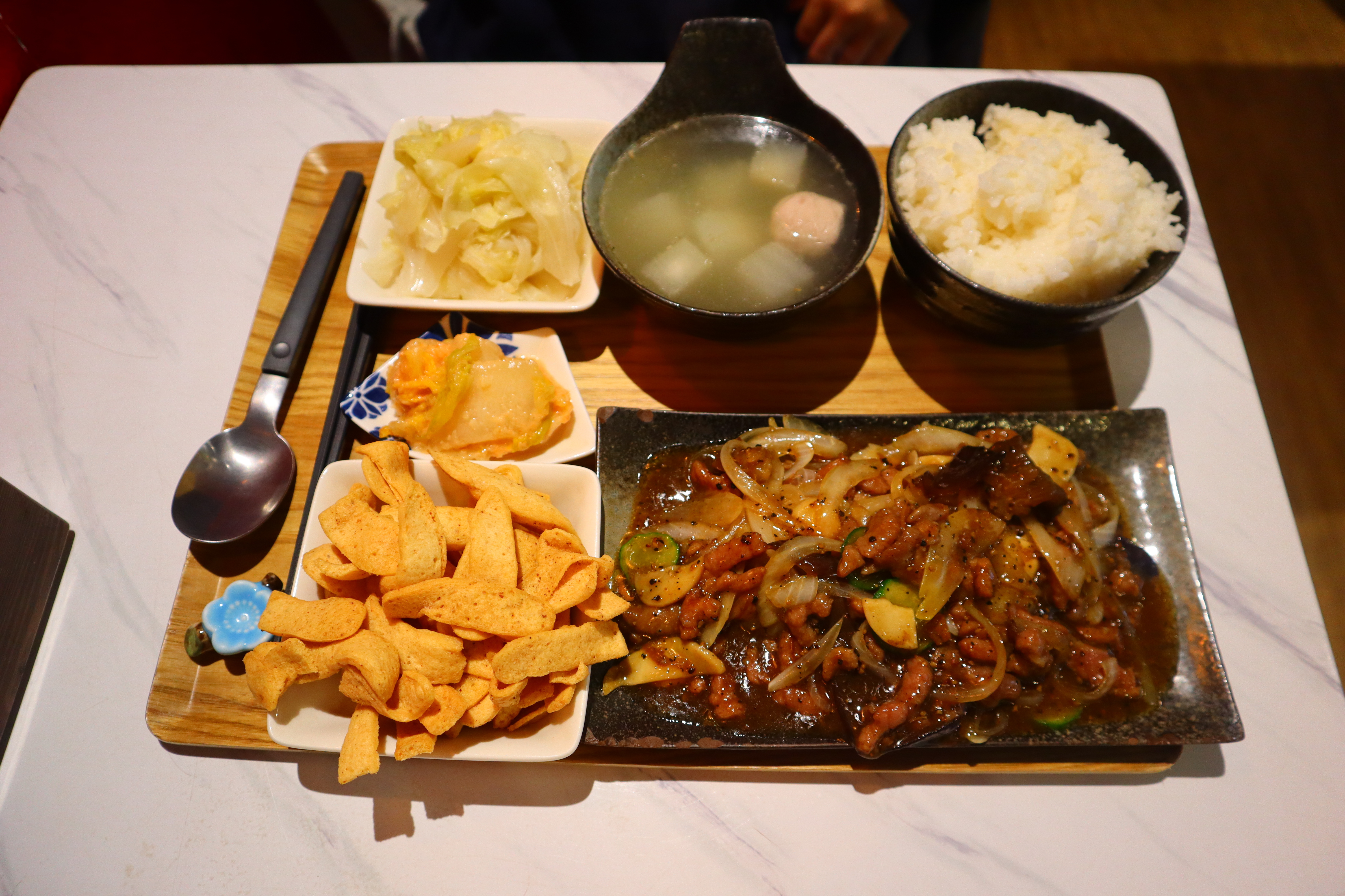 黑胡椒醬炒牛柳ft.A套餐(甜不辣餅一份+綠茶)$220+$50