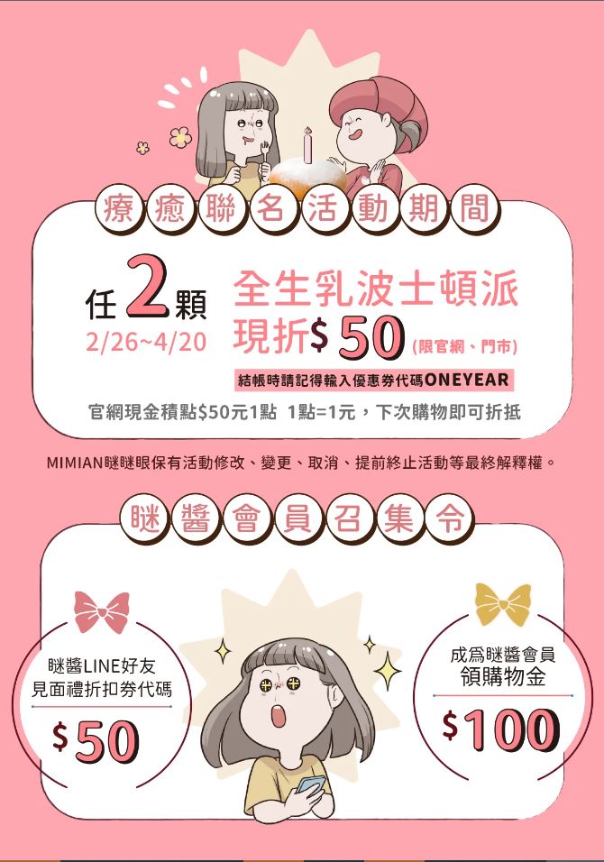 2/26~4/20活動期間任2顆全生乳波士頓派現折$50(限官網、門市)