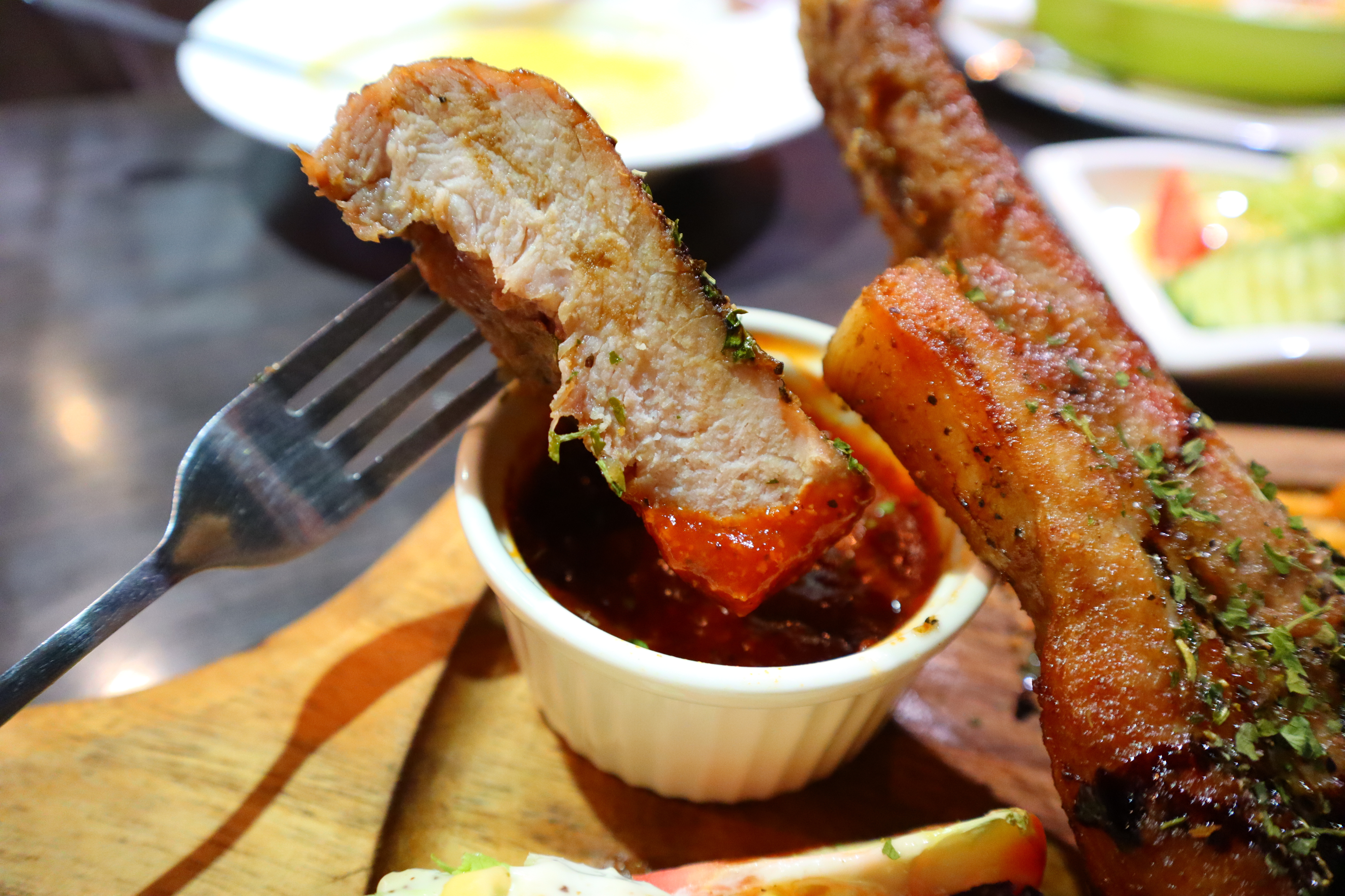 戰斧豬排外層烤得金黃酥脆,內裡則保持著多汁的肉質,咬下去時能感受到肉的彈性和油脂的融化,整體口感非常順口。