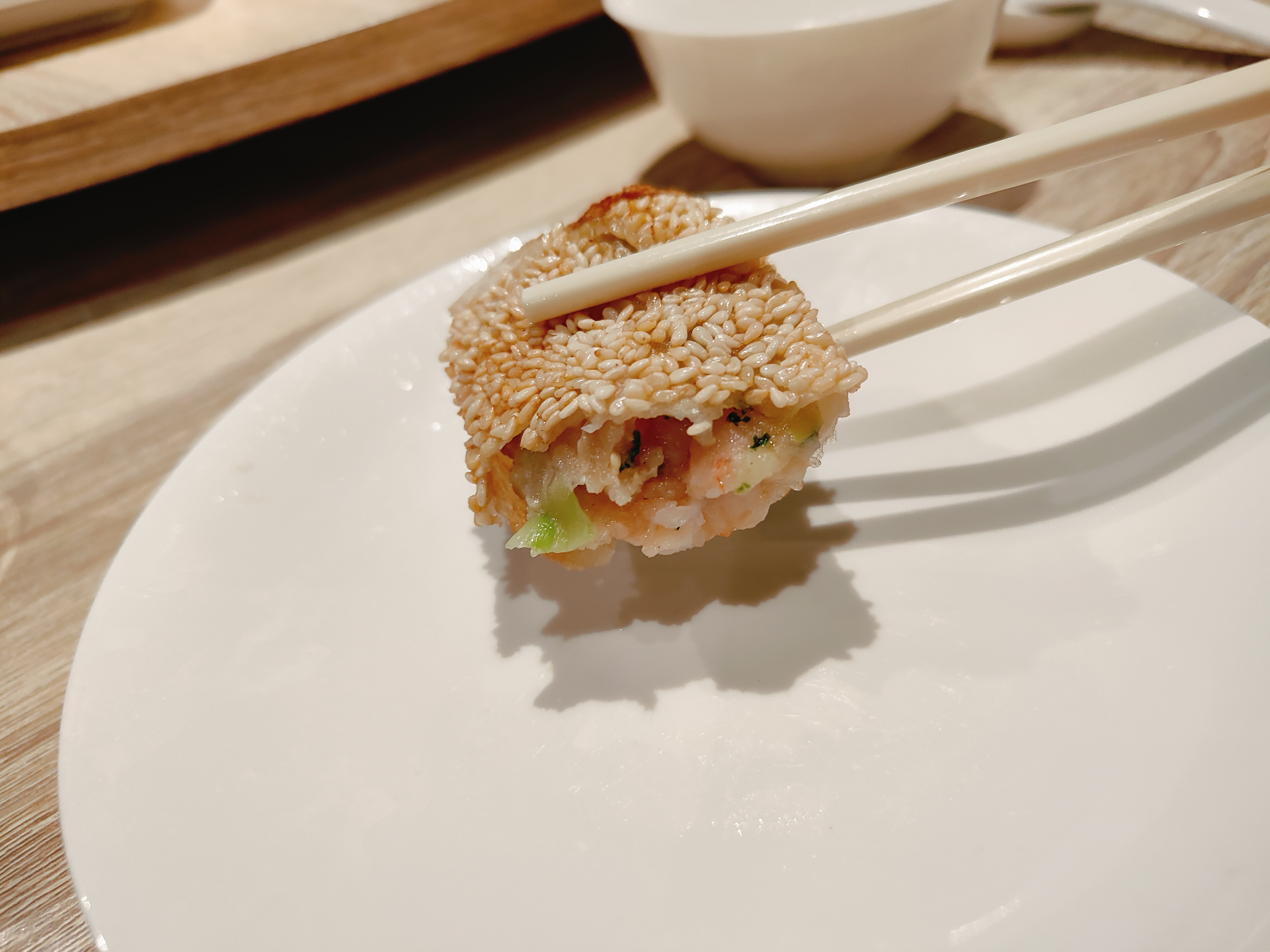 芝麻鮮蝦捲外皮酥脆,散發著濃郁的芝麻香氣,內餡則能吃到彈牙的蝦仁。
