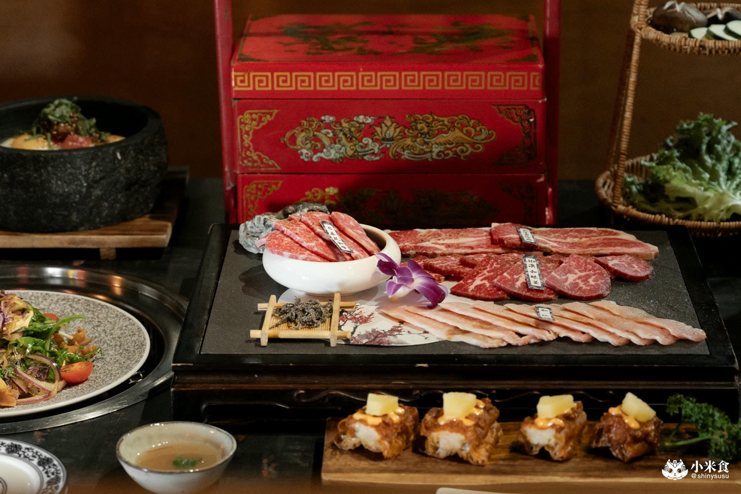 緊接登場的宴客主角是和牛盛合盤與肉品雙層手提盒,包含M9澳洲和牛眼蓋、日本花和牛