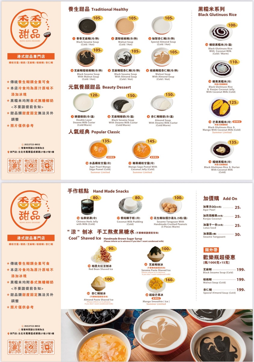 《香香甜品》菜單價格提供參考,店內還有多款養生甜品、黑糯米系列、手作仙草奶凍、香純椰子糕,以及各種口味的刨冰,無論您是想嘗試傳統港味還是探索新奇滋味,這裡都能找到心頭好。